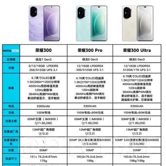 标准版厚度仅为 6.97mm,机身重量为 175g 主打轻薄。荣耀 300 Pro 与荣耀 300 Ultra 机身厚度均为 8.2mm,机身重量 199g。