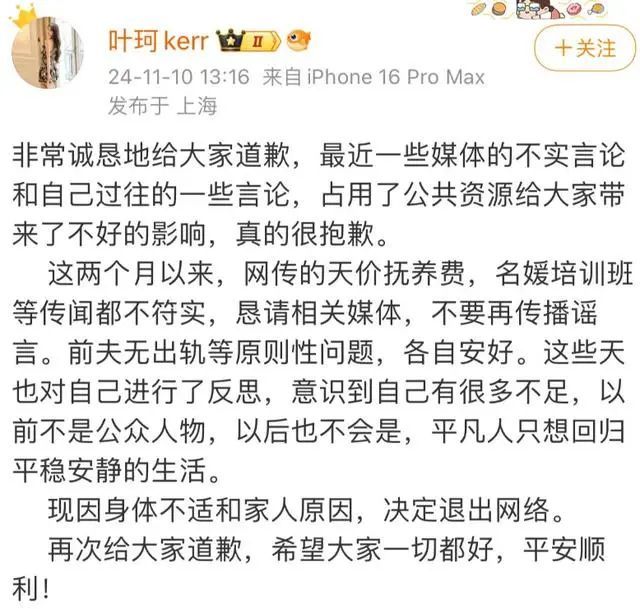 11月,在新电影开始宣传前,叶珂发文,为自己过往的言论占用公共资源而道歉,表示自己也将退出网络。她称网传的天价抚养费,名媛培训班等传闻都不符实。前夫无出轨等原则性问题,各自安好。
